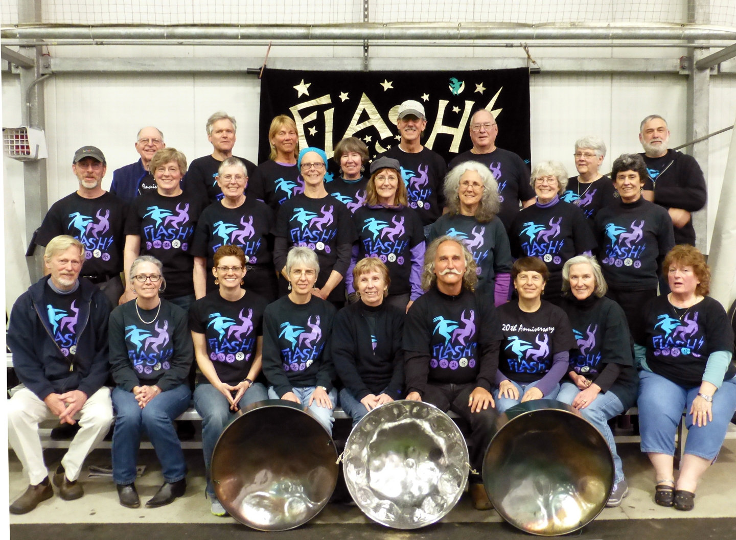 FLASH!’s approximately 35 members, many of whom have little or no prior musical background, range in age from teens to over seventy, and in their “other” lives are students, retirees, teachers, farmers, carpenters, business owners and professionals. Band members donate their time, energy, and talents for the sheer fun of spreading the joy of pan.